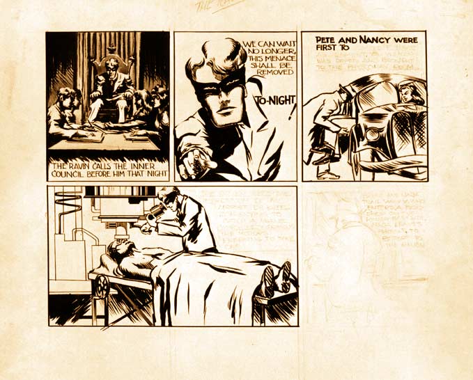 At the same time as Foster developed the Batman drawings, he also experimented with some other ideas. The only other surviving drawing is a partial "Raven" panel: